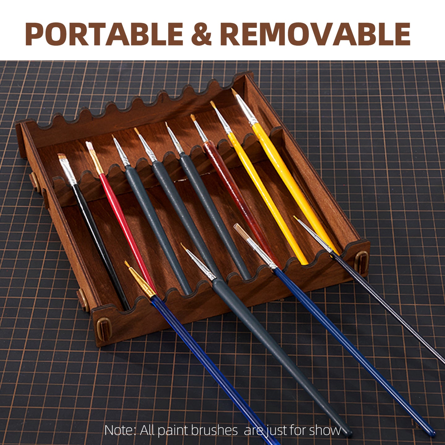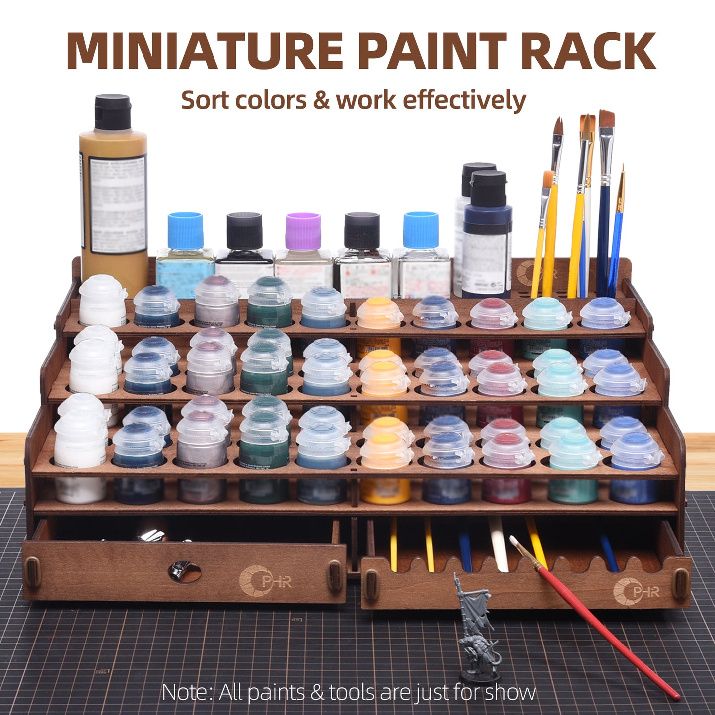 Paint Holder for Citadel, Tamiya Paints, Wooden Paint Rack with 50 Holes Dia.1.42 Inches, Includes Painting Brush Holder with 24 Slots, 1 Drawer, 25 Brush Holes